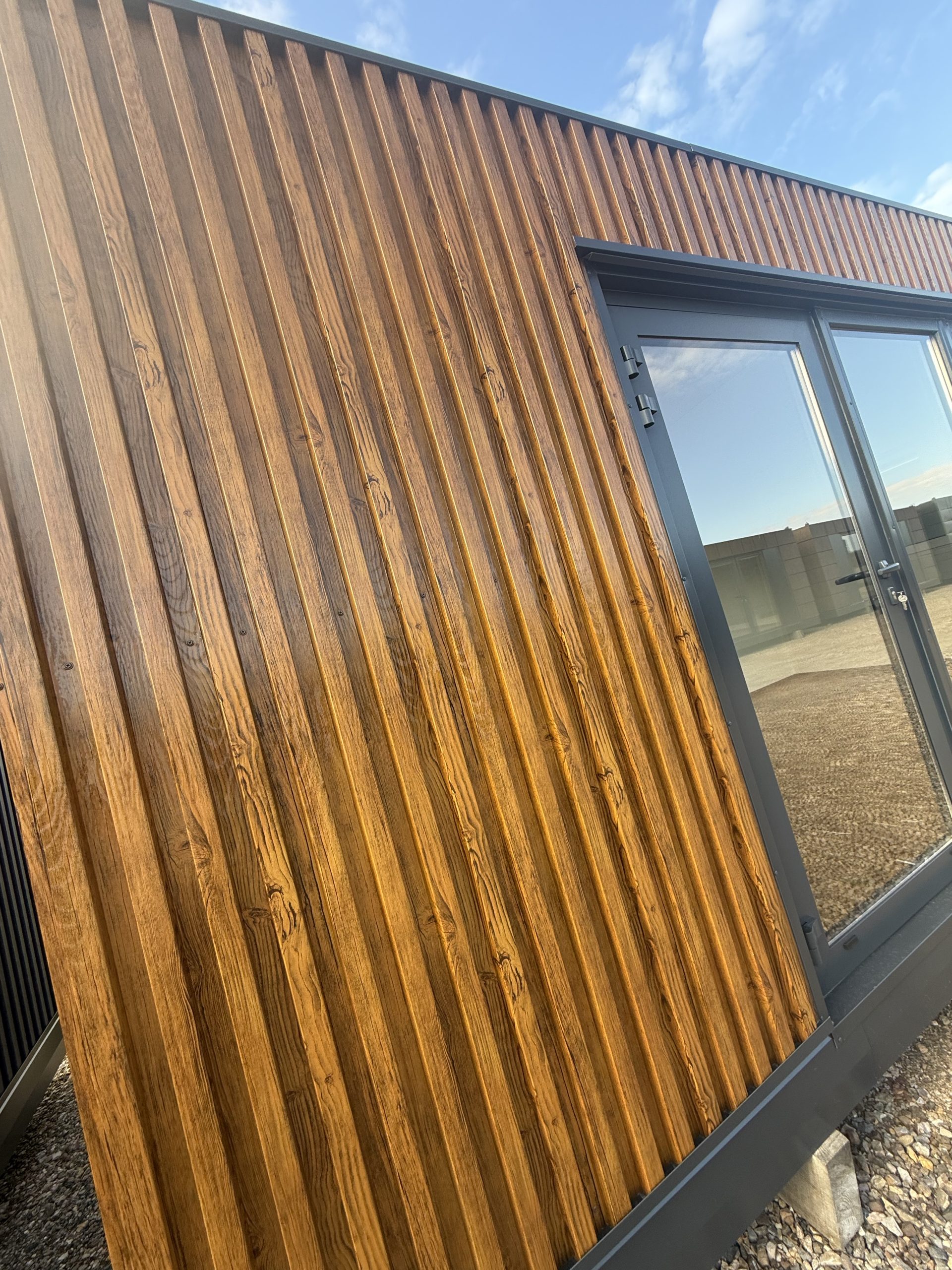 Każdy moduł możesz dopasować do swojego gustu — od minimalistycznej stali po nowoczesne okładziny drewnopodobne czy efektowne lamele pionowe. Wygląd zewnętrzny nie przypomina typowych konstrukcji kontenerowych; zamiast tego otrzymujesz elegancki, nowoczesny obiekt, który dobrze prezentuje się zarówno na działce prywatnej, jak i w otoczeniu firmowym. Dostępne są różne konfiguracje kolorów oraz faktur, dzięki którym Twój moduł nabierze indywidualnego charakteru.
